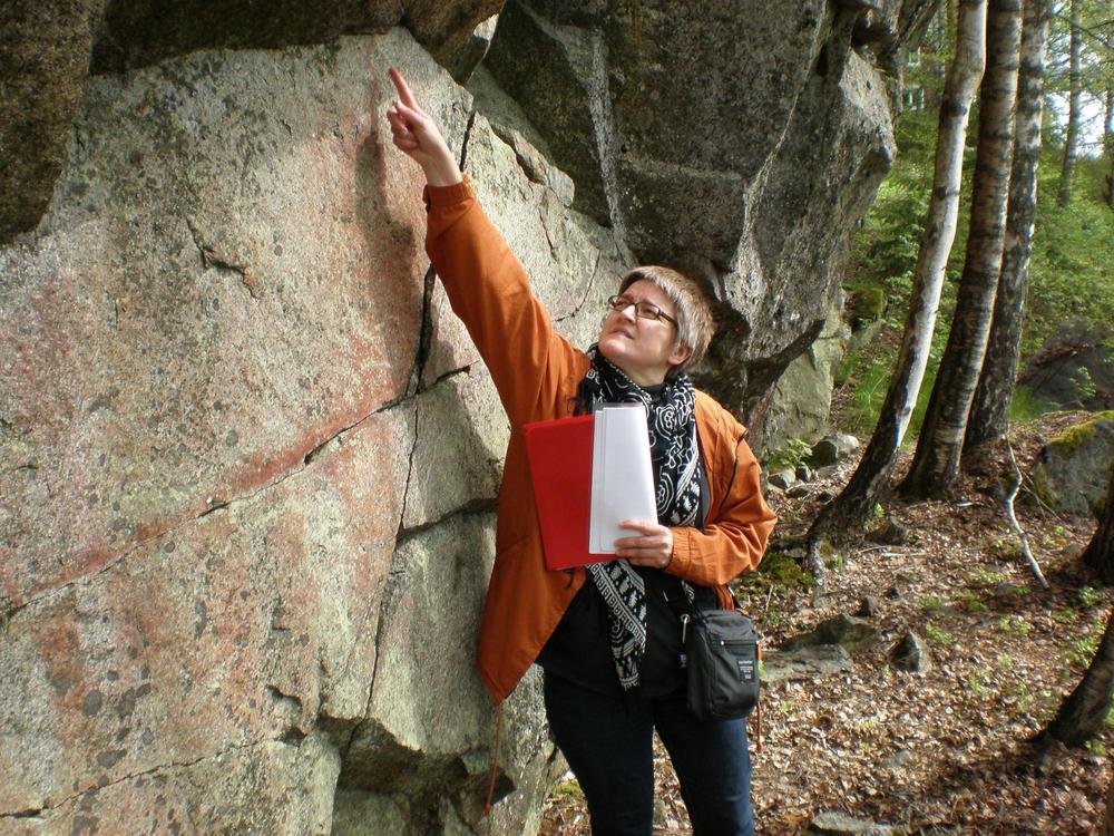 Toisena retkikohteena oli Salminkallion kalliomaalaus Evinsalossa. Maalaus sijaitsee jyrkällä kallioseinällä kapeassa salmessa kahden Kukkia-järven selän välissä. Sirkka-Liisa Seppälä esitteli maalauksen ja sen löytöhistorian ja kertoi yleisemminkin kalliomaalausten levinnästä, ajoituksista ja aiheista. Yhdessä Eero Ojasen ja Johanna Sepän kanssa Seppälä pohti maalauksen tulkintaa ja käyttötarkoitusta eri tutkijoiden näkemysten pohjalta. Uutena ajatuksena tuotiin esiin ääni maalausten yhteydessä. Ehkä ei kyse ollutkaan hiljaisesta mietiskelystä vaan voimallisesta äänenkäytöstä! Ainakin lopuksi tehty koe kallioseinämän kaikupohjasta onnistui hyvin.