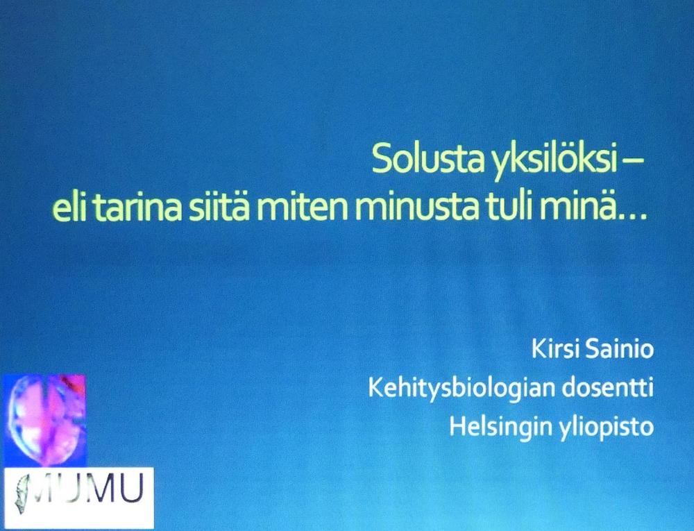 4.5. 2024 klo 14.00 Kehitysbiologian dosentti Kirsi Sainio - "Solusta yksilöksi" -luennon teemana oli alkion ihmeellinen kehitys solusta yksilöksi.