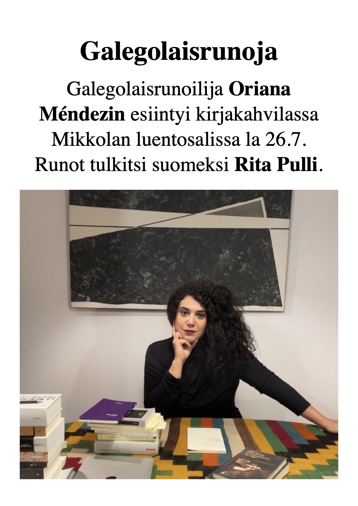 esitteli viimeaikaista tuotantoaan ("Koti asuu sisällä" -runokokoelma, "Rajat auki" -tietokirja sekä tekeillä oleva brasilialaisen modernistisen runouden antologia...) kirjakahvilassa Mikkolan luentosalissa lauantaina 9.8. Häntä haastatteli MuMun puheenjohtaja Tiina Poutanen.