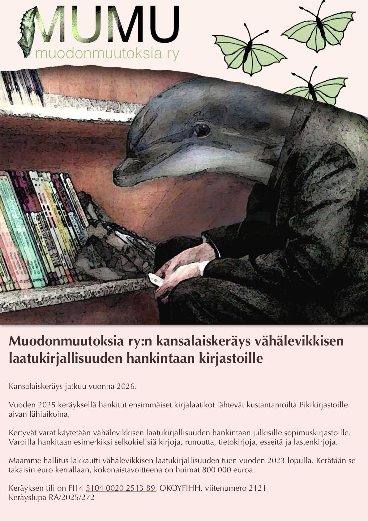 Muodonmuutoksia ry kerää rahaa, jolla kirjastot voivat hankkia vähälevikkistä laatukirjallisuutta, runoja, selkokirjoja, tietokirjoja, esseitä novelleja, lastenkirjoja jne.